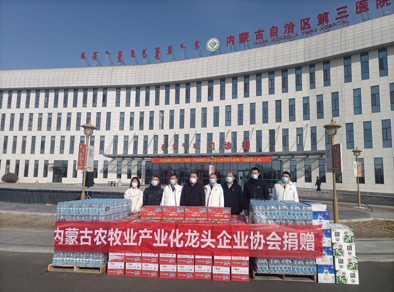 眾志成城,抗擊疫情。為助力呼和浩特市快速打贏新冠肺炎疫情防控阻擊戰(zhàn),慰問一線疫情防控人員,2月25日,由內(nèi)蒙古自治區(qū)工商聯(lián)組織,內(nèi)蒙古農(nóng)牧業(yè)產(chǎn)業(yè)化龍頭企業(yè)協(xié)會等多家商協(xié)會和愛心企業(yè)積極參與的捐贈儀式,在內(nèi)蒙古自治區(qū)第三醫(yī)院舉行。自治區(qū)黨委統(tǒng)戰(zhàn)部副部長、工商聯(lián)黨組書記梁淑琴,黨組成員白春艷,自治區(qū)工商聯(lián)一級巡視員屈晨然、二級巡視員呂萬海、武軍,宣教部部長熊玲玲,內(nèi)蒙古農(nóng)牧業(yè)產(chǎn)業(yè)化龍頭企業(yè)協(xié)會會長周勇、執(zhí)行秘書長呼群、部長陳海燕等參加捐贈儀式。
