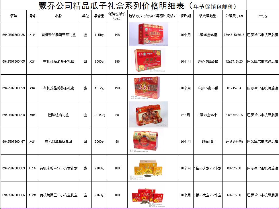 呼市鄂爾多斯大街石羊橋十字路西移動大廳西20米北巷,現有大量年節(jié)禮品盒:巴盟有機葵花子禮盒低價促銷包郵,聯系電話:15334782928,十盒包郵,價格如下: