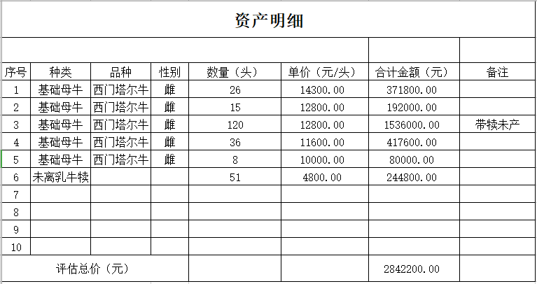 2)本次轉(zhuǎn)讓的標(biāo)的中包含:體質(zhì)稍壯帶有未離乳牛犢的基礎(chǔ)母牛有26頭、體質(zhì)稍弱帶有未離乳牛犢的基礎(chǔ)母牛有25頭、帶犢未產(chǎn)的基礎(chǔ)母牛有110頭、體質(zhì)稍壯未孕未帶犢基礎(chǔ)母牛有36頭、體質(zhì)稍弱未孕未帶犢基礎(chǔ)母牛有8頭、未離乳牛犢51頭(為前述26+25頭基礎(chǔ)母牛所生)。