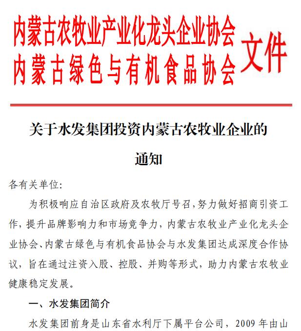 關(guān)于水發(fā)集團投資內(nèi)蒙古農(nóng)牧業(yè)企業(yè)的通知