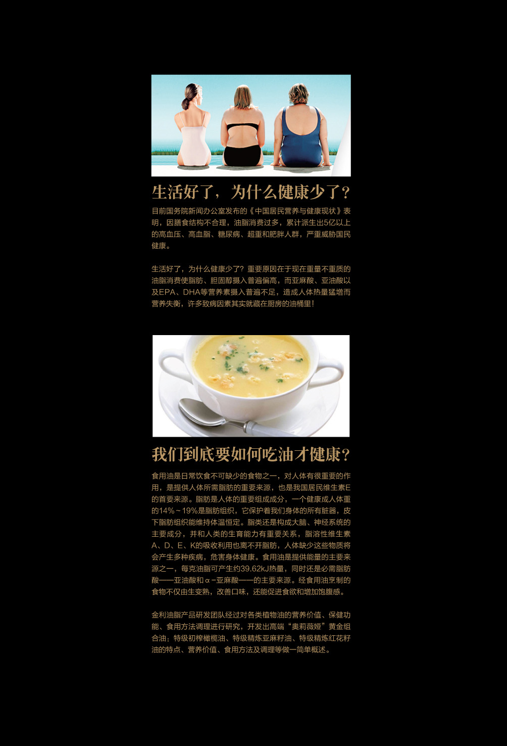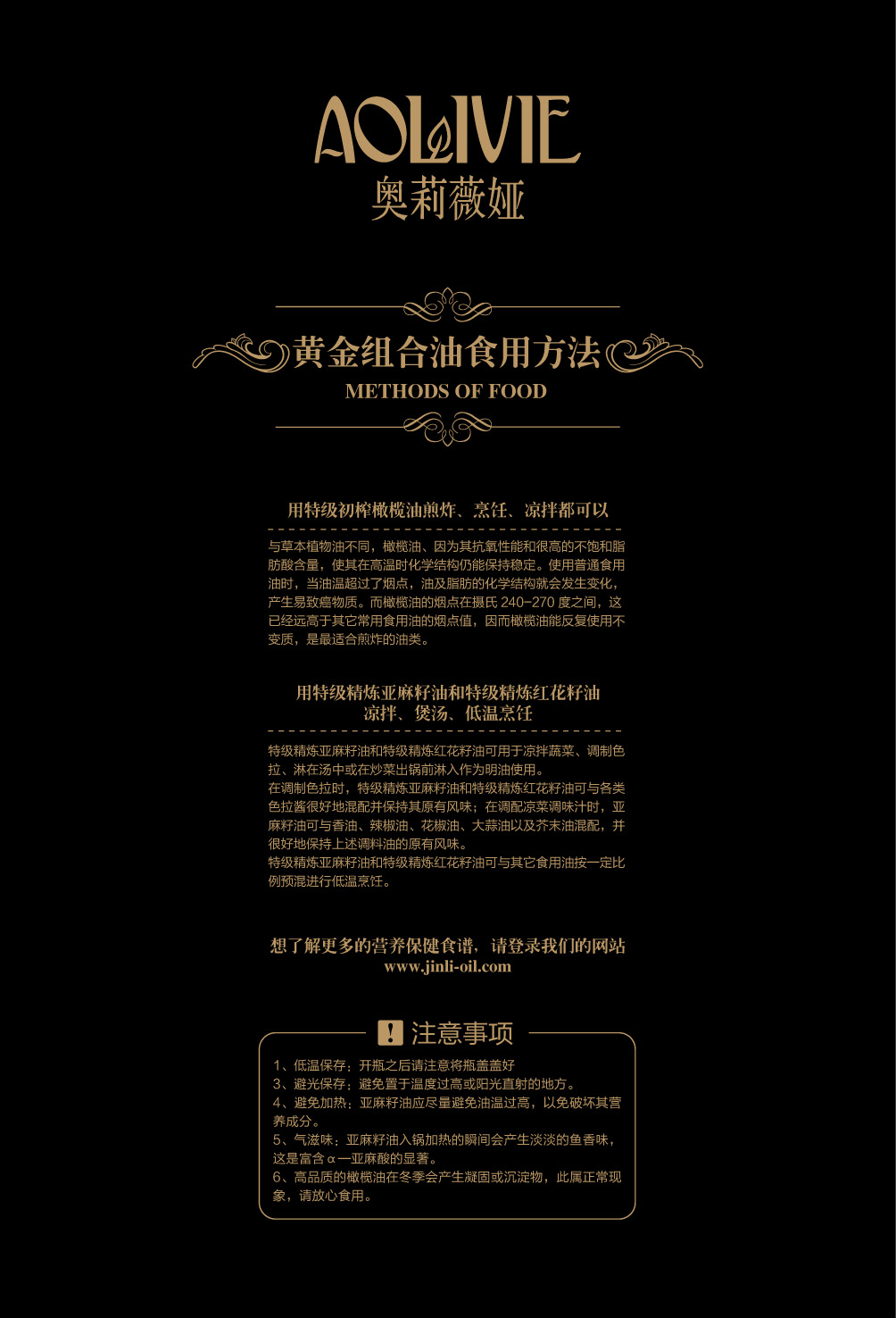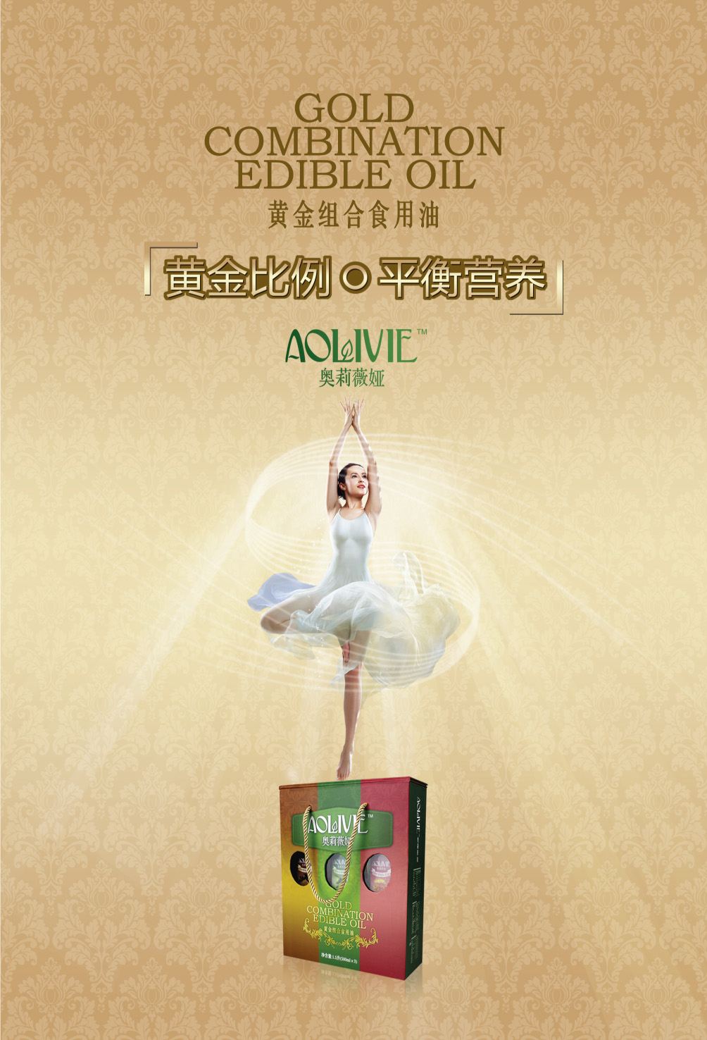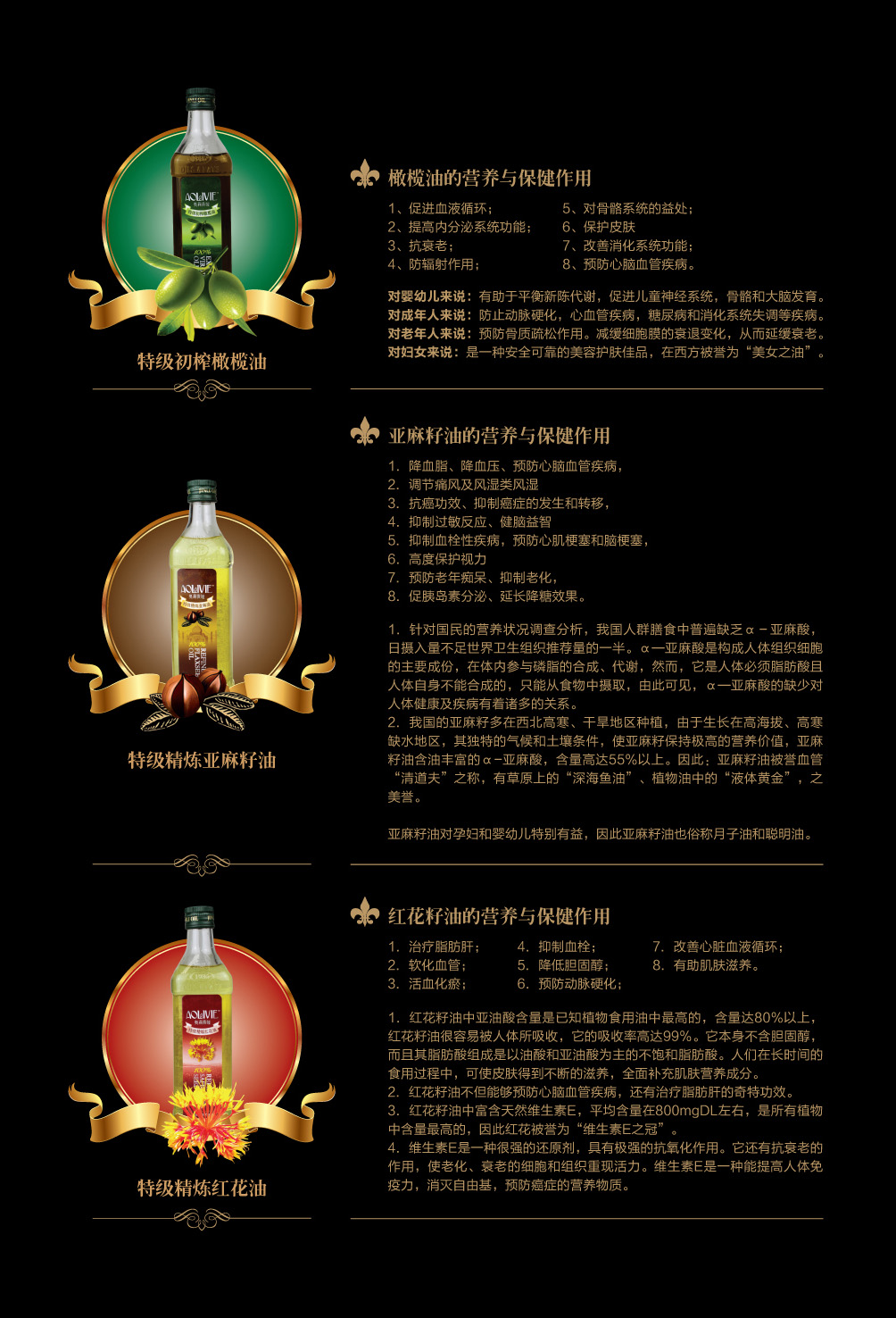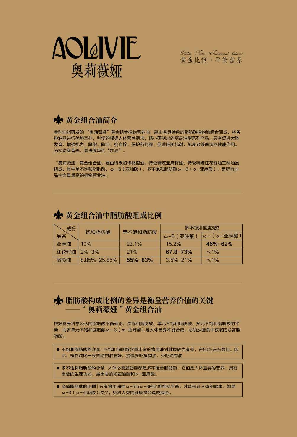 金利油脂(蘇州)有限公司研發(fā)的:“奧莉薇婭黃金組合植物營(yíng)養(yǎng)油,有各具特色的脂肪酸植物油組合而成,將各種油品進(jìn)行優(yōu)勢(shì)互補(bǔ),科學(xué)的根據(jù)人體營(yíng)養(yǎng)需求,精心研制出的高端油脂系列產(chǎn)品。具有促進(jìn)大腦發(fā)育/增強(qiáng)視力/降脂/降血壓/抗血栓/保護(hù)前列腺/促進(jìn)脂肪代謝/抗衰老等良好的保健作用。為您均衡營(yíng)養(yǎng)/增強(qiáng)體質(zhì)而“加油”?!皧W莉薇婭黃金組合油,是有特級(jí)初榨橄欖油/特級(jí)冷榨亞麻籽油/特級(jí)精煉紅花籽油三種油品組成,其中單不飽和脂肪酸/α—亞麻酸和亞油酸,是所有植物油中含量最高植物營(yíng)養(yǎng)油。