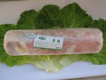 剔骨羔羊胴體羊肉(必須有后腿肉)常規(guī)修肉、去三角線(xiàn)硬皮部分、去掉全部背筋,順紋擺放,瘦肉朝外卷,肥瘦搭配均勻,部分碎肉(小于10%),肉塊順向碼放。