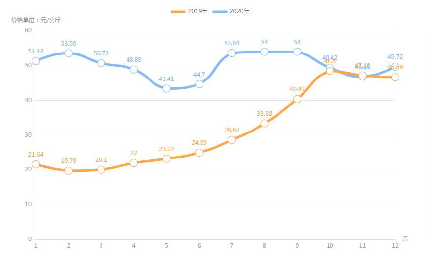 豬肉(白條豬)最高價格出現(xiàn)在2020年12月40.79元/公斤,最低價格出現(xiàn)在2019年2月13.67元/公斤。