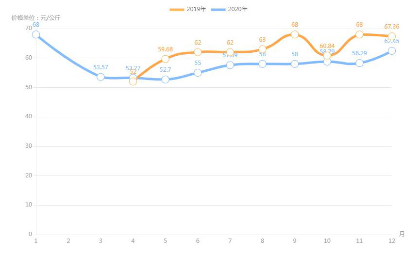 對內(nèi)蒙古幾大農(nóng)貿(mào)批發(fā)市場羊肉價進行匯總分析得出:呼和浩特市內(nèi)蒙古美通農(nóng)產(chǎn)品批發(fā)市場羊肉最高價格出現(xiàn)在2020年11月68元/公斤,最低價格出現(xiàn)在2019年4月52元/公斤。呼和浩特市東瓦窯批發(fā)市場羊肉最高價格出現(xiàn)在2020年12月73.38元/公斤,最低價格出現(xiàn)在2019年5月61.08元/公斤。包頭市友誼蔬菜批發(fā)市場羊肉最高價格出現(xiàn)在2020年12月67.16元/公斤,最低價格出現(xiàn)在2019年3月54元/公斤。內(nèi)蒙古赤峰西城市場羊肉最高價格出現(xiàn)在2019年9月75.52元/公斤,最低價格出現(xiàn)在2019年3月56.97元/公斤。羊肉價格和去年同期相比整體上漲,漲幅基本在每公斤5-15元左右。