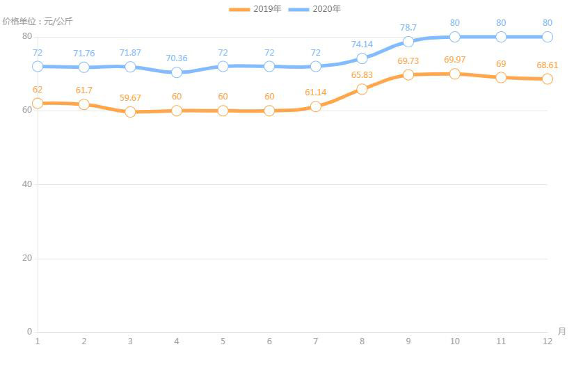 據(jù)農(nóng)業(yè)農(nóng)村部對全國500個集貿(mào)市場監(jiān)測,2020年12月第二周,全國羊肉價格為每公斤82.66元,連續(xù)八周上漲,同比上漲3.6%。業(yè)內(nèi)人透露,目前,養(yǎng)羊成本上升;人們對羊肉品質(zhì)的要求也越來越高,消費者更加傾向于選擇有質(zhì)量認證標志和品牌的羊肉產(chǎn)品,特別是優(yōu)質(zhì)、味美的新鮮羊肉,加上羊肉產(chǎn)量不高,供應不足,拉動了羊肉價格上漲。